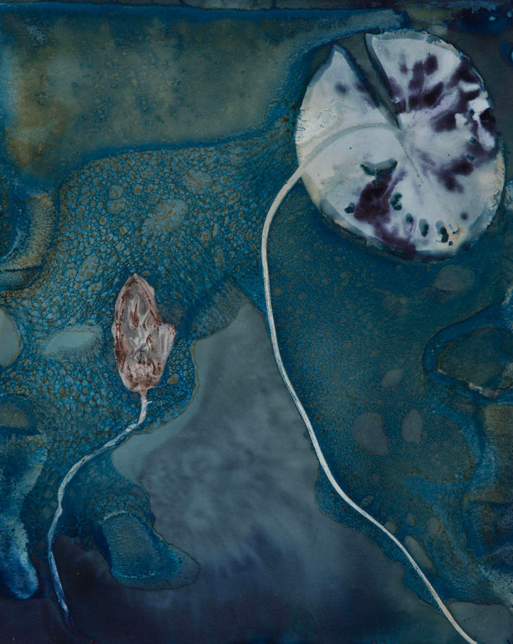 These are all plants collected locally in the Finger Lakes and printed on hand-coated cyanotype paper. The wet process and sunlight create textural and color variations as the prints are exposed.